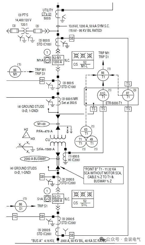 對(duì)于87-T1變壓器差動(dòng)或87-B1母線差動(dòng)等差動(dòng)保護(hù)電路,CT的方向相反,這允許差動(dòng)繼電器測(cè)量進(jìn)入變壓器或母線的電流,并扣除流出的電流。當(dāng)流入保護(hù)區(qū)的電流大于按比例流出的電流時(shí),繼電器會(huì)感應(yīng)到“差動(dòng)”,并高速跳閘斷路器,以防止該區(qū)域任何地方的故障。